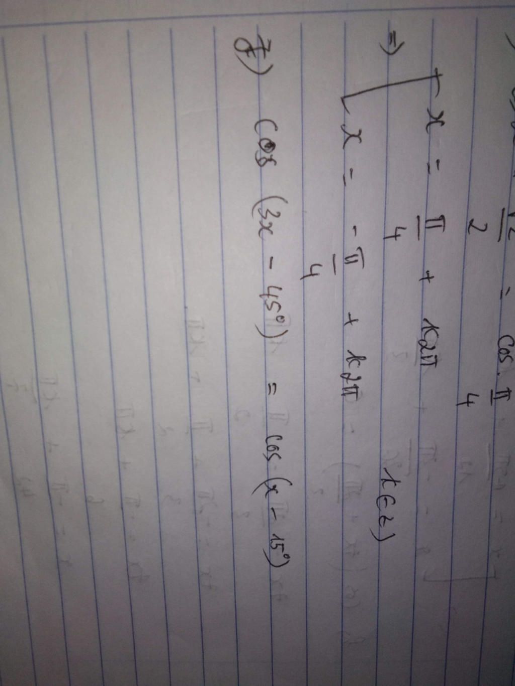 $\Leftrightarrow \left[\begin{array}{l}3x - 45^o = x - 15^o + k.360^o\\3x - 45^o = 15^o - x + k.360^o\end{array}\right.$