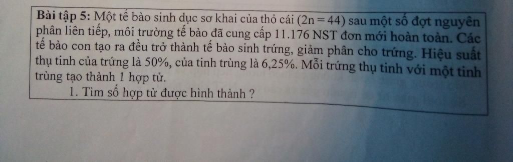 a+c,Ta có : Một tế bào sinh dục sơ khai của thỏ cái ($2n= 44$) sau một số đợt nguyên phân liên tiếp, môi trường tế bào đã cung cấp $11.176$ NST đon mới hoàn toàn
