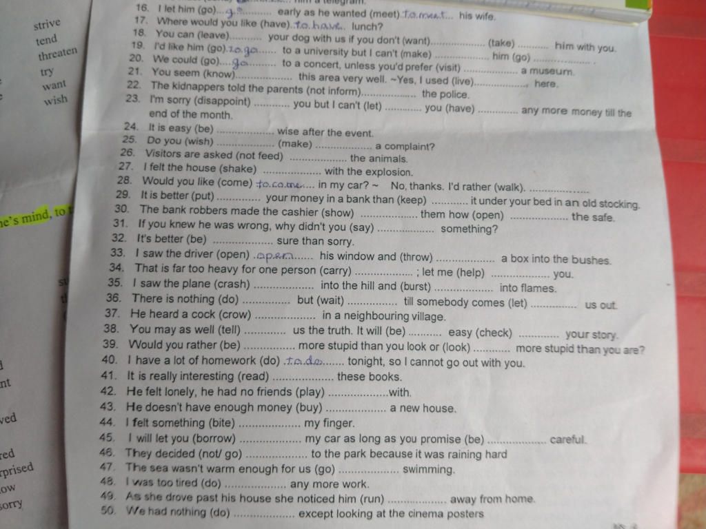 Động từ nguyên mẫu có “to” (To infinitive) 1. Động từ nguyên mẫu có to được dùng làm 2. Động từ nguyên mẫu có to sử dụng trong cấu trúc Verbs + Object + To infinitive 3. Động từ nguyên mẫu có to đứng sau từ nghi vấn (question words) Động từ nguyên mẫu không có “to” (Bare infinitive) 1. Động từ nguyên mẫu không to thường đi với Make/ let/ help 2. Động từ nguyên mẫu không to đứng sau động từ chỉ cảm giác, giác quan (Verbs of perception) 3. Động từ nguyên mẫu không to đứng sau “had better” 4. Động từ nguyên mẫu không to sử dụng với WHY Rút gọnĐộng từ nguyên mẫu có “to” (To infinitive) 1. Động từ nguyên mẫu có to được dùng làm 2. Động từ nguyên mẫu có to sử dụng trong cấu trúc Verbs + Object + To infinitive 3. Động từ nguyên mẫu có to đứng sau từ nghi vấn (question words) Động từ nguyên mẫu ... xem thêm