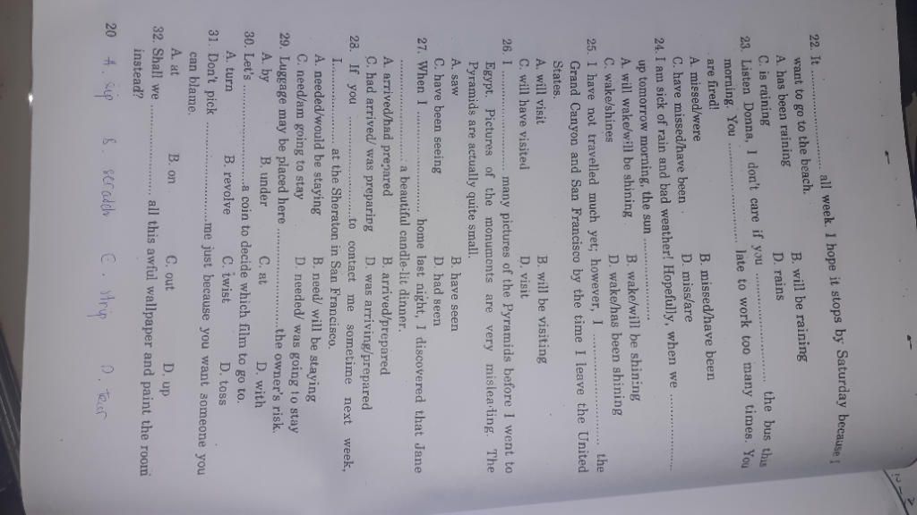 23. B missed (xảy ra ở QK) - have been (hành động xảy ra ở QK có thể tiếp tục ở tương lai)