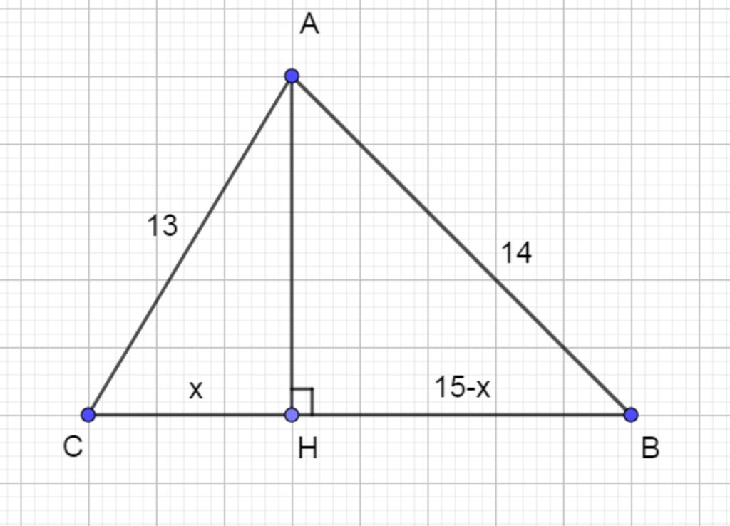 Kẻ $AH⊥BC$, đặt $HC=x$, $HB=15-x$ (đơn vị: $cm$)