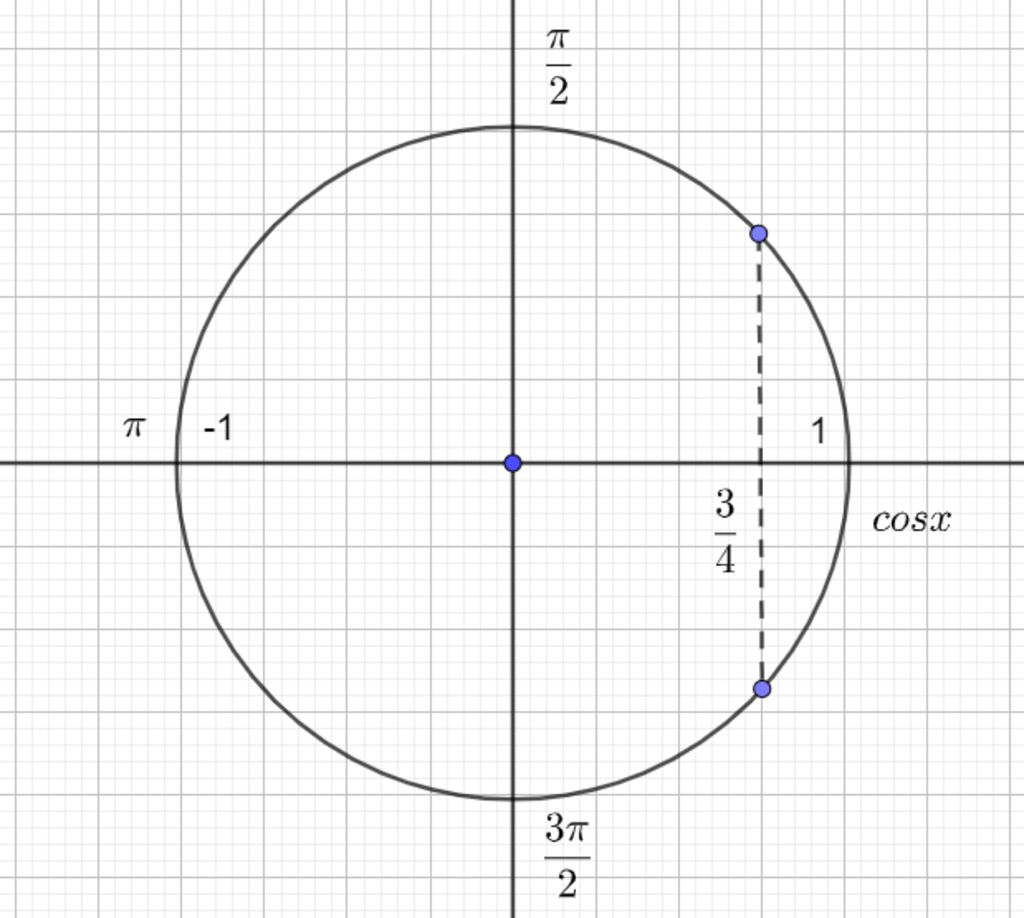 Trên $\Bigg[-\dfrac{\pi}{2};2\pi\Bigg]$, $cosx=\dfrac{3}{4}$ có ba nghiệm, trong đó: