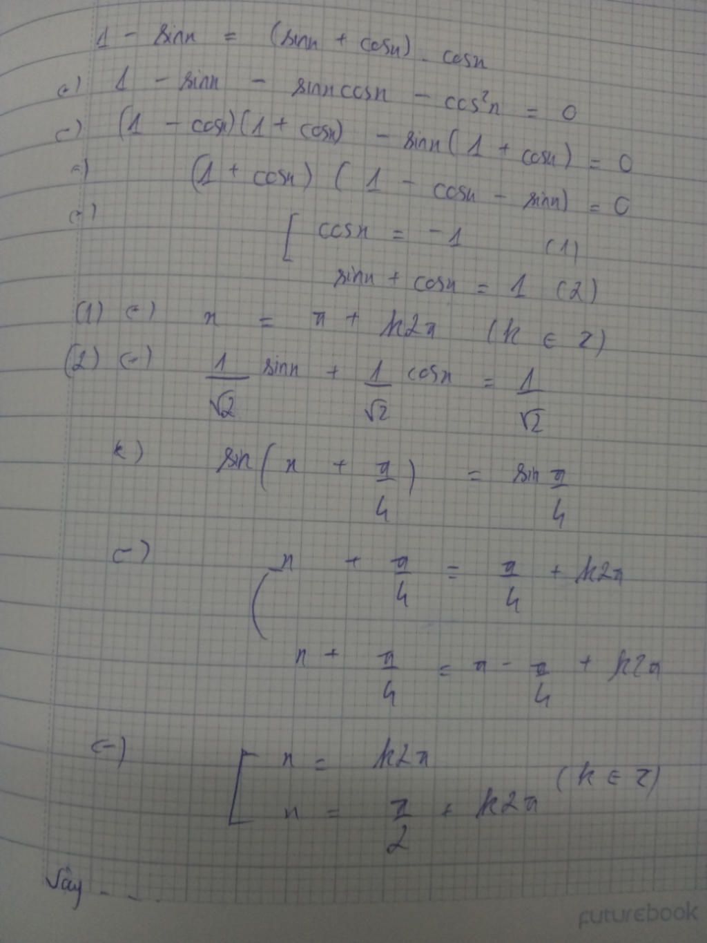 gộp ( 1 - cos^2) và ( -sinx - sinx.cosx) lại thành 2 cặp cái ( 1 - cos^2) là hằng đẳng thức a^2 - b^2 còn cái cặp 2 là đặt sinx làm nhân tử chung