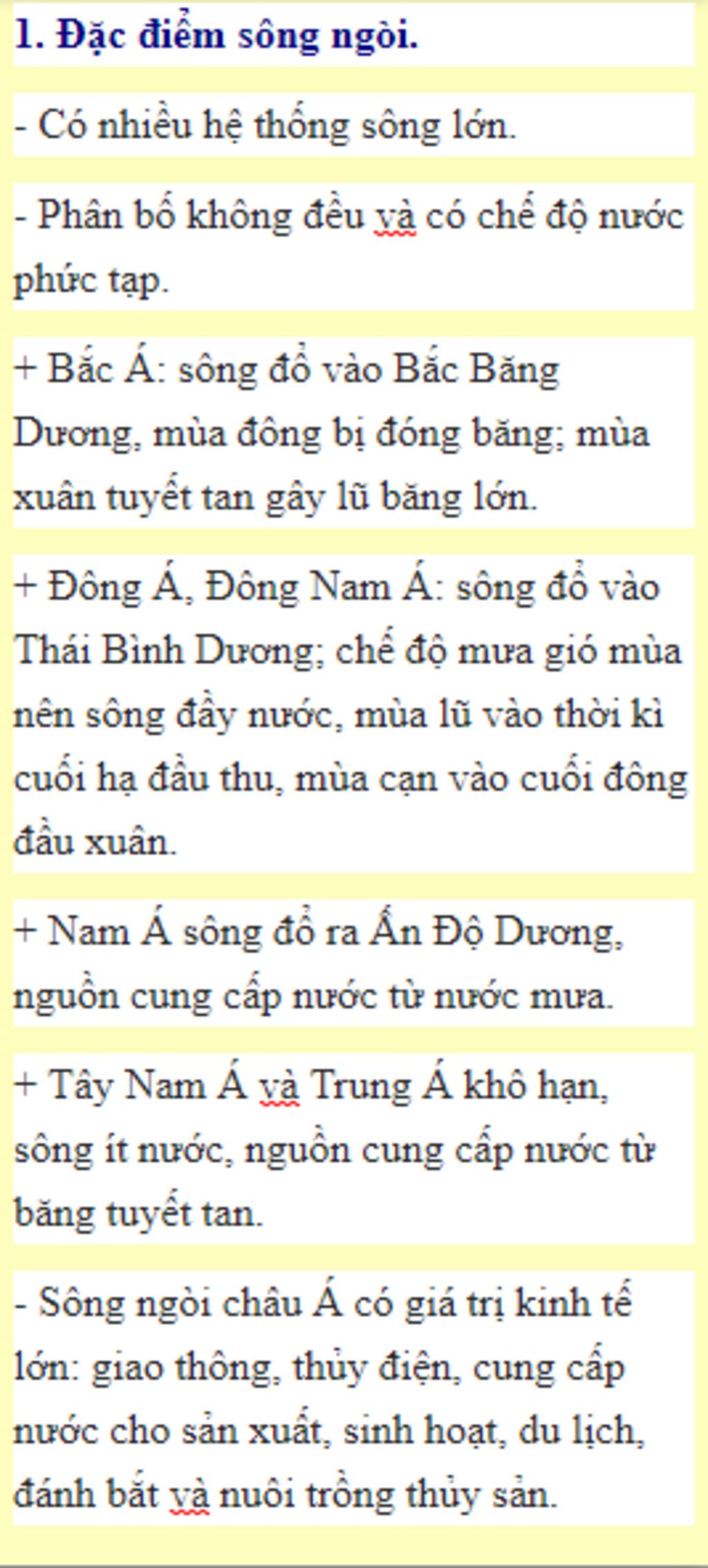 - Các sông ở châu Á phân bố không đều và có chế độ nước khá phức tạp.