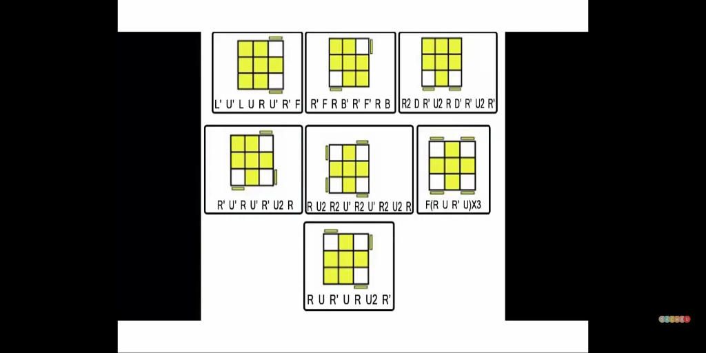 Th1: Viên ko chứa vàng có màu trùng ô trung tâm và mặt trên có màu của bên trái rubik. Ct : U' L' U L F' L F L'.