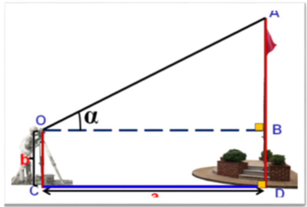 Một người đặt giác kế thẳng đứng cách cột cờ một khoảng a = 9m, chiều cao giác kế b = 1,5 m. Chỉnh giác kế sao cho khi ngắm theo khe ngắm của giác kế ta nhìn thấy đỉnh A của cột cờ. Đọc trên giác kế số đo ∝=36 độ của góc AOB (như hình bên). Hỏi chiều cao của cột cờ là bao nhiêu mét? (Làm tròn đến chữ số thập phân thứ nhất)