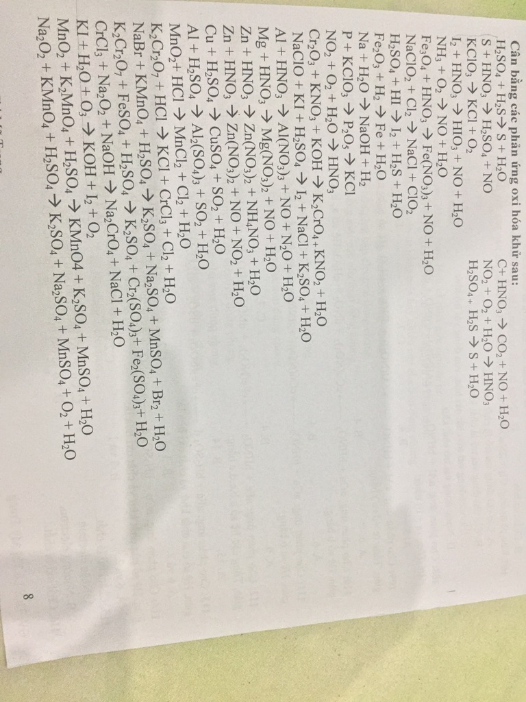 1,H2SO4+H2S S+H20 S HNO3 +,H2SO4NO KCIO3 KCI+O2 I2+HNO3 HIO3 +NO + H20 NH3O2 NO +H2O Fe3O4+ HNO3 Fe(NO3)3 + NO + H2O NACIO2+ Cl2 NaCl +ClO2 H2SO4+ HI I2 + H2S + H2O Fe2O3 + H2 Fe + H2O Na + H2O NaOH + H2 P +KCIO3 P2O5 KCI NO2 + O2+ H20 HNO3 Cr2O3+ KNO3 NACIO+ KI +H2SO4I2+ NaCl + K2SO4 +H2O Al + HNO3 Al(NO3)3 + NO + N2O+ H2O Mg + HNO3 Mg(NO3)2 + NO + H20 Zn +HNO3 Zn(NO3)2 + NH4NO3 + H20 Zn+HNO3 Zn(NO3)2 + NO + NO2+ H20 Cu+ H2SO4 CUSO4 + SO2 + H20 Al+ H2SO4 Al2(SO4)3 + SO2 + H20 MnO2+ HCl MnCl2 + Cl2 + H2O K2Cr2O7 + HCl KCI + CrCl3 + Cl2+ H20 NaBr+ KMnO4+ H2SO4 K2SO4+ Na2SO4 + MnSO4+ Br2 + H20 K2CR2O7+ FeSO4 + H2SO4 K2SO4 + Cr2(SO4)s+ Fe2(SO4)s+ H20 CrCl3 + Na2O2 + NaOH Na2CrO4+ NaCl + H20 KI+ H20+ O3 KOH+ I2 + O2 MnO2+ K2MnO4 + H2SO4 KMn04 + K2SO4+ MnSO4+ H20 Na O2 + KMnO4 + H2SO4 K2SO4 + Na2SO4+ MnSO4+ 02+ H20 C+ HNO3 CO2 + NO + H2O NO2+O2H20 HNO3 H2SO4+ H2S S+H20 KOH K2CrO4+ KNO2 + H20 8