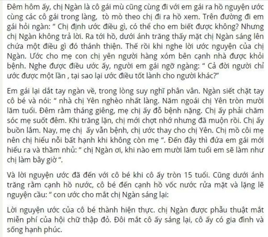 - Em ạ, nhà chị Yên xóm mình nghèo nhất làng. Năm ngoái chị Yên tròn mười lăm tuổi. Đêm rằm tháng Giêng, mẹ chị ấy đổ bệnh, chị ấy phải chăm sóc mẹ suốt đem. Khi trăng lặn, biết mình không có cơ hội nói điều ước thiêng liêng, chị ấy đã khóc như mưa. Nay mẹ chị ấy vẫn bệnh, chị ước thay cho chị Yên. Chị mồ côi mẹ nên chị hiểu nỗi bất hạnh khi không còn mẹ
