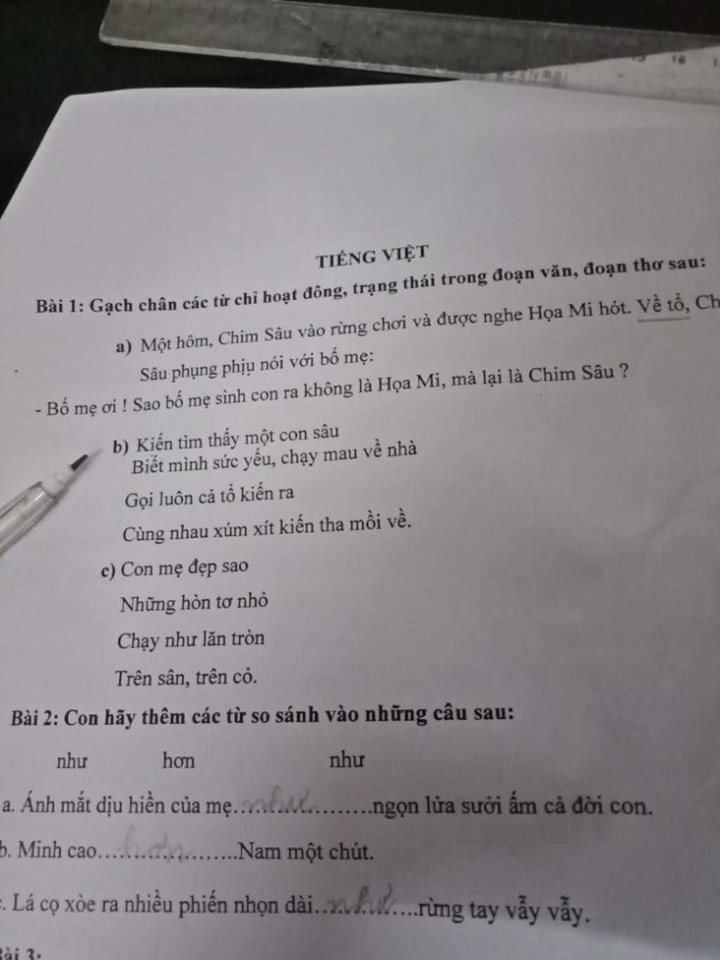 Bài 1: Gạch chân các từ chi hoạt đông, trạng thái trong đoạn văn, đoạn thơ sau: