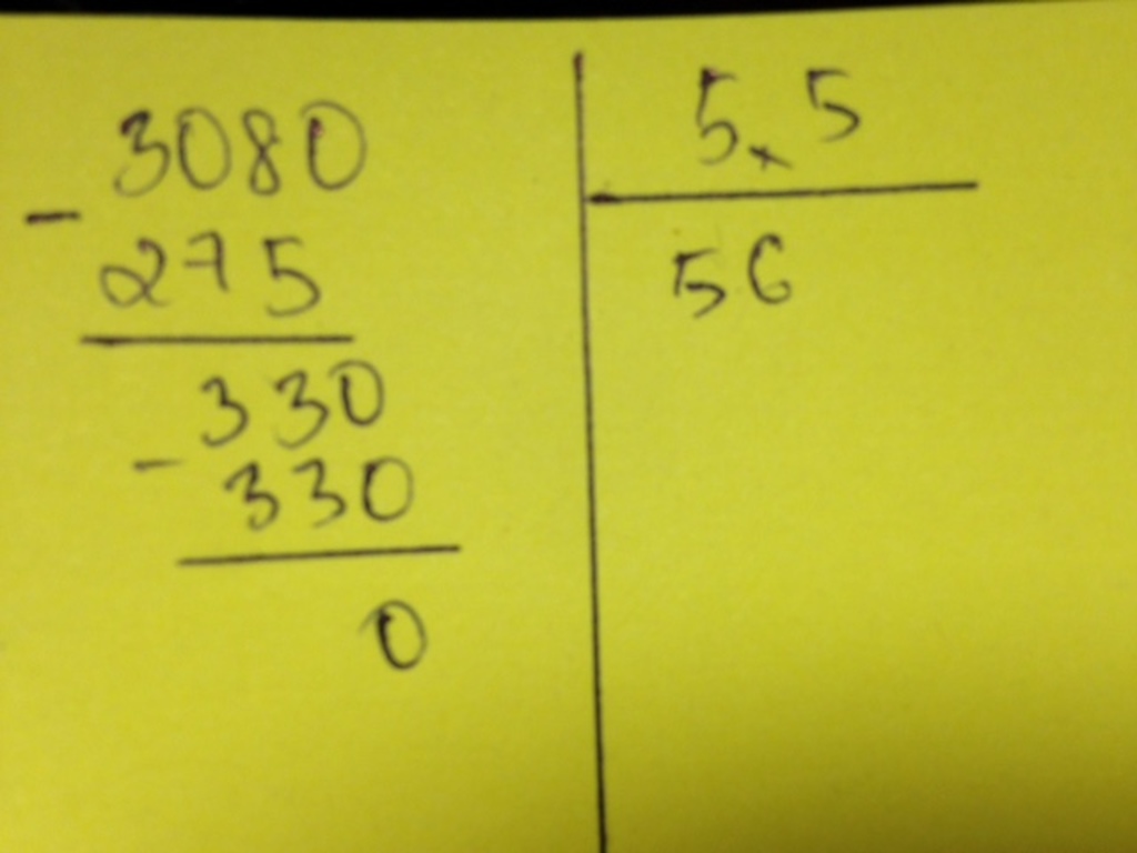 - Nên ta viết thêm một chữ số `0` và bên phải số bị chia `308` ta được `3080`; bỏ dấu phẩy ở `5,5` đi được `55`