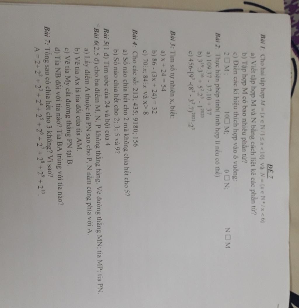 Bài 1: Cho hai tập hợp M (xeN/1sx<10) và N (xe N /x<6}