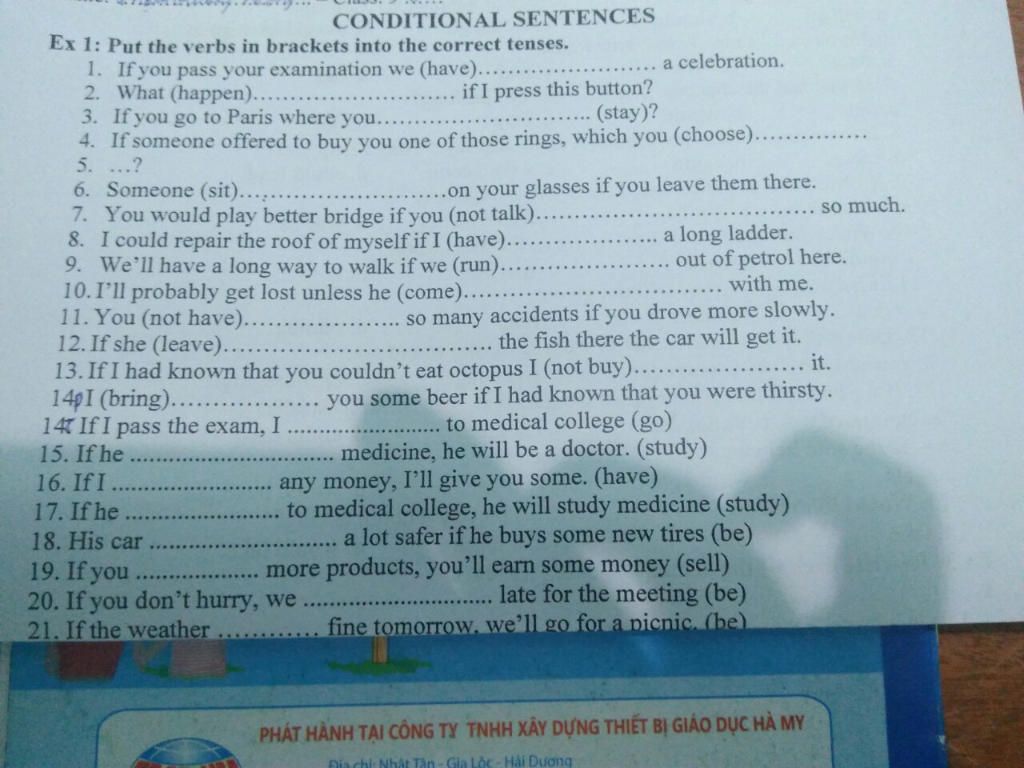 1 have, 2 will happen, 3 will you stay, 4 would you choose, 5 ko có đề, 6 sits, 7 didn"t talk, 8 had, 9 run, 10 comes, 11 wouldn't have, 12 leaves, 13 wouldn't have bought, 14 would have brought, 14 will go, 15 studies, 16 have, 17 studies, 18 will be, 19 sell, 20 will be, 21 is