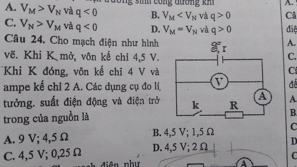 r = \dfrac{{E - U}}{I} = \dfrac{{4,5 - 4}}{2} = 0,25\Omega