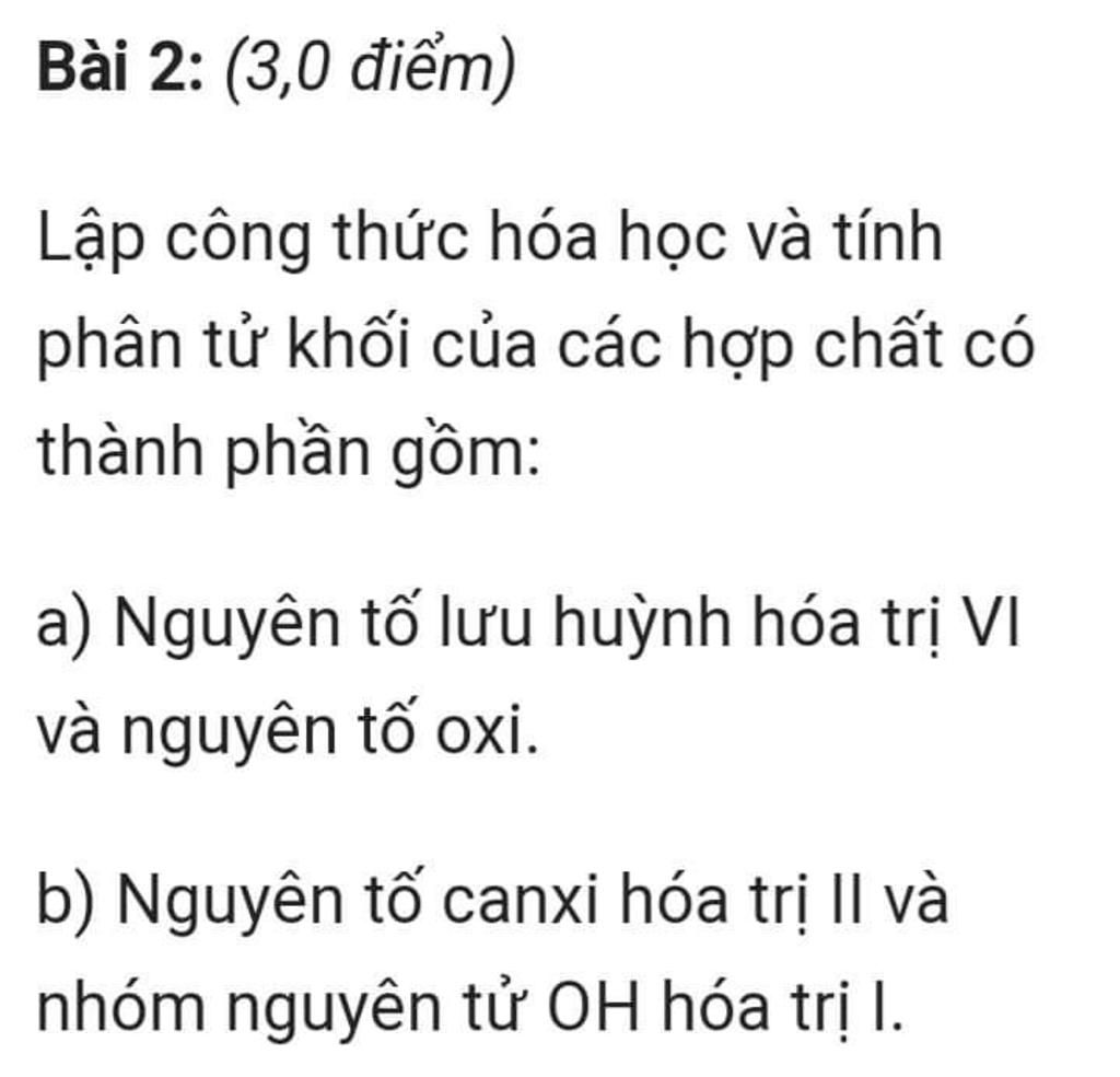 Câu a bạn sửa cho mk thành: \(\begin{array}{l} \text{Gọi CTHH của hợp chất là S$_x$O$_y$}\\ \text{Theo quy tắc hóa trị:}\ x.VI=y.II\ \rightarrow \dfrac{x}{y}=\dfrac{II}{VI}=\dfrac{1}{3}\\ \Rightarrow x=1;\ y=3\\ \text{Vậy CTHH của hợp chất là SO$_3$}\\ PTK\ SO_3=32+3\times 16=80\ (đvC)\end{array}\) Rút gọnCâu a bạn sửa cho mk thành: \(\begin{array}{l} \text{Gọi CTHH của hợp chất là S$_x$O$_y$}\\ \text{Theo quy tắc hóa trị:}\ x.VI=y.II\ \rightarrow \dfrac{x}{y}=\dfrac{II}{VI}=\dfrac{1}{3}\\ \Rightarrow x=1;\ y=3\\ \text{Vậy CTHH của hợp chất là SO$_3$}\\... xem thêm