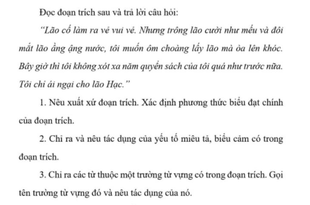 1: Đoạn trích trên nằm trong tác phẩm "Lão Hạc" của nhà văn Nam Cao. PTBĐ chính Tự Sự .