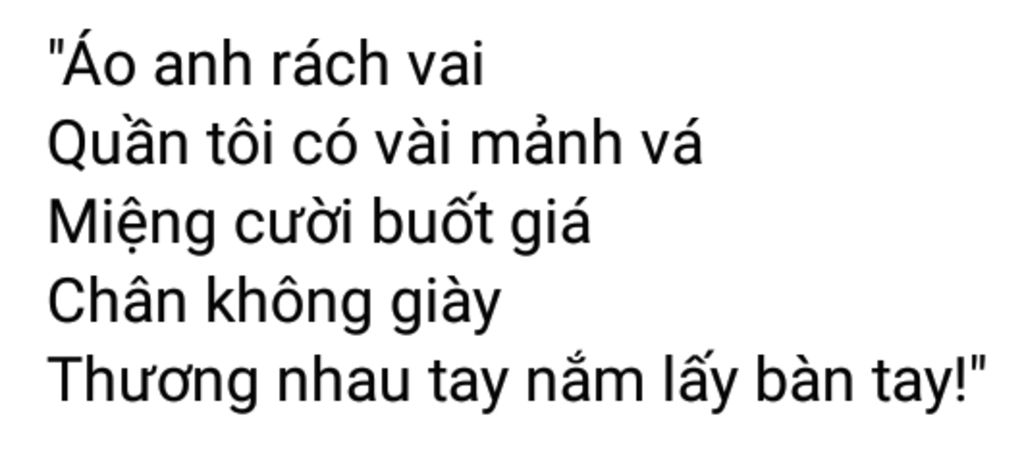 ⇒ "Áo anh rách vai / Thương nhau tay nắm lấy bàn tay!" là một cặp trò chuyện trong thời tiết lạnh giá, dưới tiết trời buốt đôi tay, chỉ còn cách nắm lấy bàn tay nhau cho giữ thân nhiệt cơ thể.