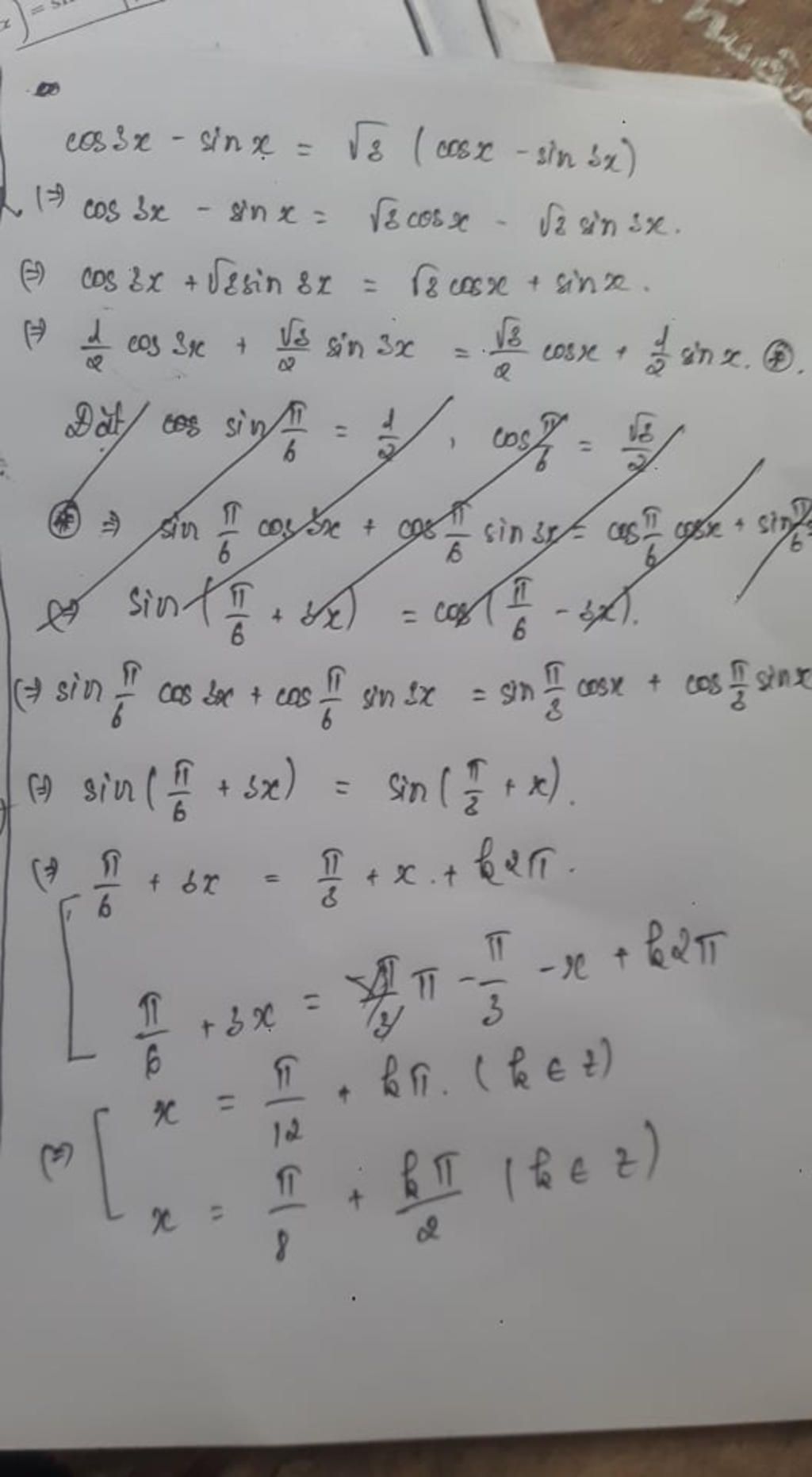 $\Leftrightarrow \dfrac{1}{2}\cos3x + \dfrac{\sqrt3}{2}\sin3x =\dfrac{\sqrt3}{2}\cos x + \dfrac{1}{2}\sin x$