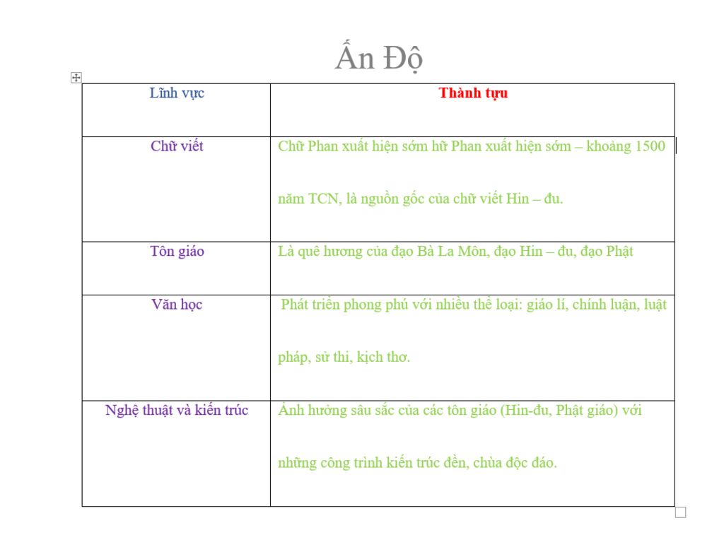 Thành tựu Chữ viếtChữ Phan xuất hiện sớm – khoảng 1500 năm TCN, là nguồn gốc của chữ viết Hin – đu.Tôn giáo: Là quê hương của đạo Bà La Môn, đạo Hin – đu, đạo Phật .Văn học: Phát triển phong phú với nhiều thể loại: giáo lí, chính luận, luật pháp, sử thi, kịch thơ.Nghệ thuật kiến trúc: Ảnh hưởng sâu sắc của các tôn giáo (Hin-đu, Phật giáo) với những công trình kiến trúc đền, chùa độc đáo.