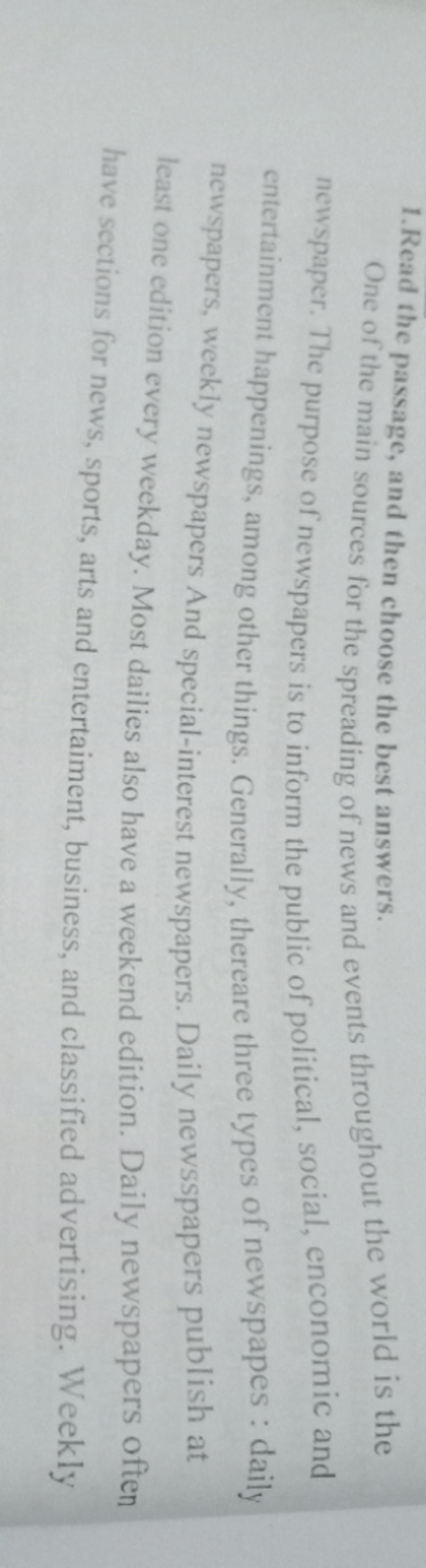 1, The purpose of newspapers is to inform the public of political, social, economic and entertainment happenings, among other things