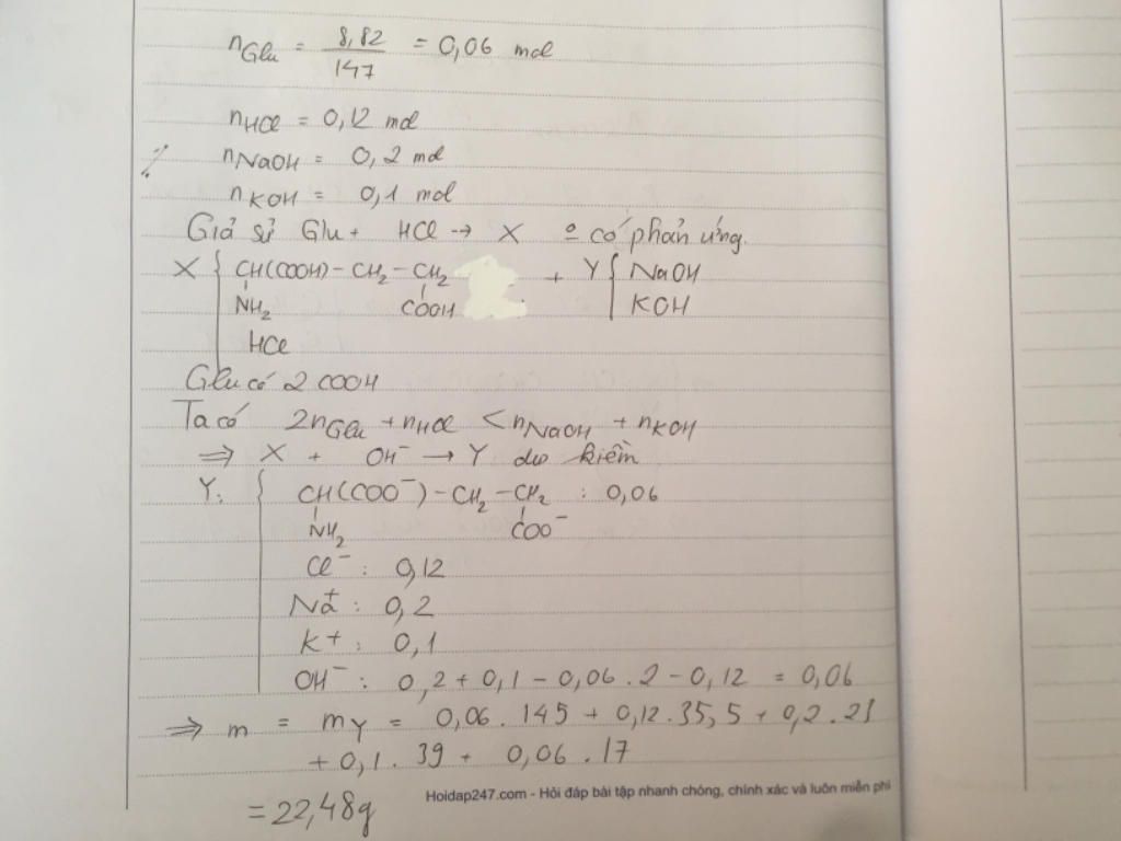 Cho axit glutamic tác dụng với \(HCl\) sau đó tác dụng với \(NaOH;KOH\) cũng giống như cho 2 axit tác dụng với 2 loại kiềm.