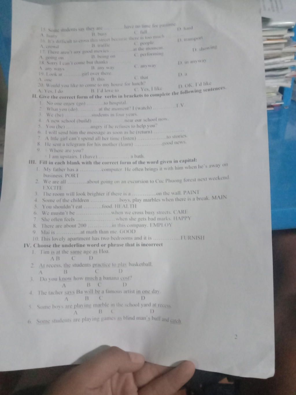 1. No one enjoys going to the hospital. ( Đề này bị sai chính tả nha!)