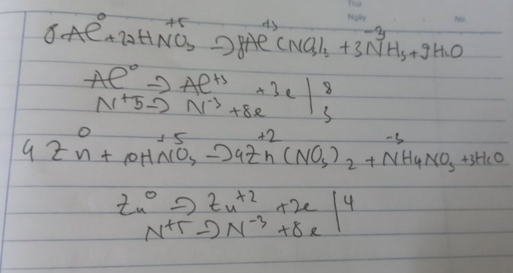$Al^{0}+H\overset{+5}{N}O_3\to \overset{+3}{Al}(NO_3)_3+\overset{-3}{N}H_3+H_2O$ $Al^0\to Al^{+3}\Rightarrow +3 e\\ N^{+5}\to N^{-3}\Rightarrow -8e$ $\Rightarrow PTHH :8Al+27HNO_3\to 8Al(NO_3)_3+3NH_3+9H_2O$