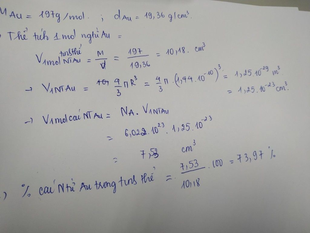 $\rm V_{1\ nguyen\ tu\ Au}=\dfrac{4}{3}\pi.R^3=\dfrac{4}{3}\pi.(1,44.10^{-8})^3≈1,25^{-23}\ (cm^3)$