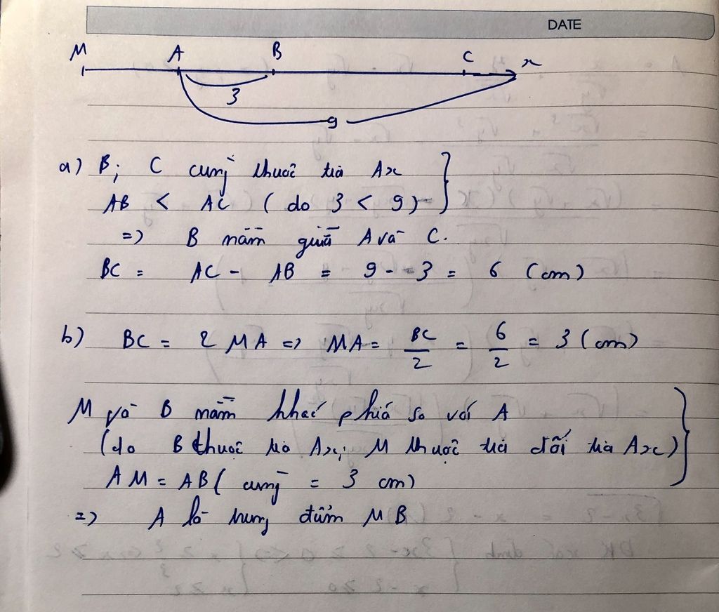 b) Trên tia đối của tia Ax lấy điểm M sao cho BC = 2MA. Điểm A có là trung điểm của đoạn thẳng MB không? Vì sao?