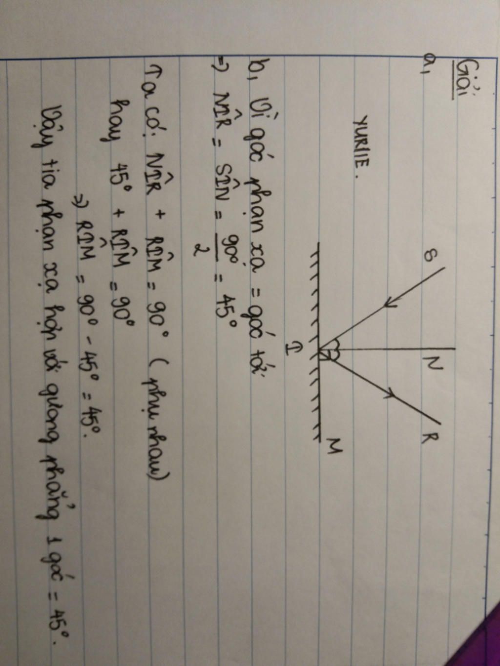 -vẽ pháp tuyến IN là tia phân giác của SIR-vẽ gương vuông góc vs pháp tuyến-có NI là tia phân giác cua SIR => SIN=NIR=90 đọ /2 = 45 đọ-có góc họp bởi tia p xạ và gương = 90 đọ -45 đo = 45 độ (NI vuong góc vs gương )