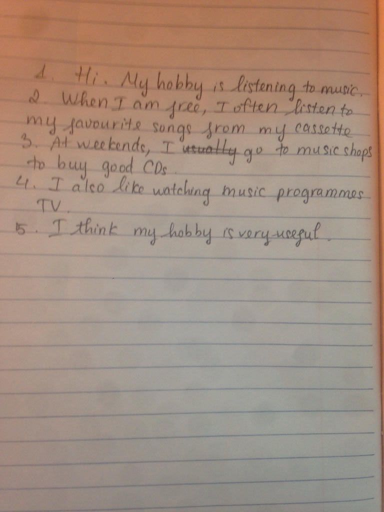 Hi. My hobby is listening to music. When I am free, I often listen to my favorite songs in my cassette.At weekends, I go to music shops to buy good CDs. I also like watching music programs on TV. I think my hobby is very useful.
