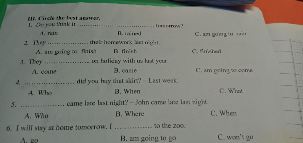 1. Do you think it rain tomorrow? ( nếu đề sai thì là C nha "am --> is" )