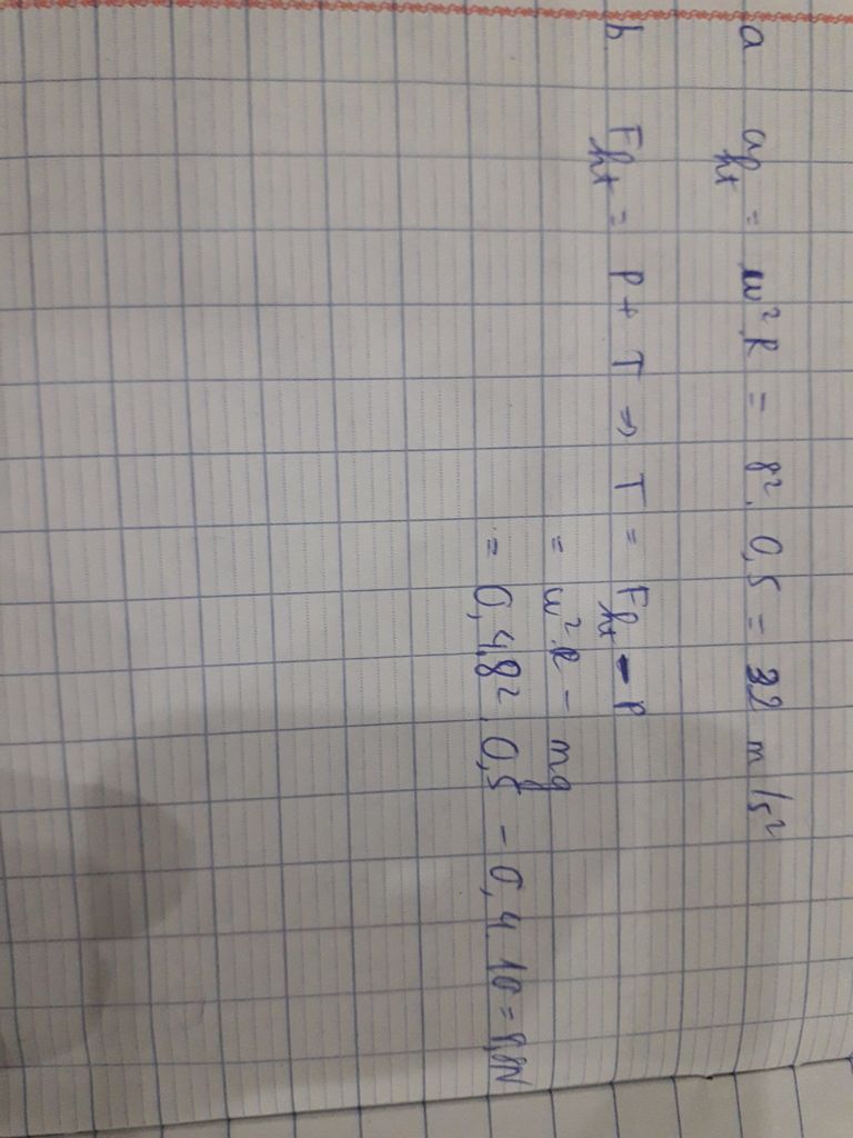 \Rightarrow T = m{\omega ^2}R-mg\;\; = {0,4.8^2}.0,5-0,4.10 = 8,8{\rm{ }}N