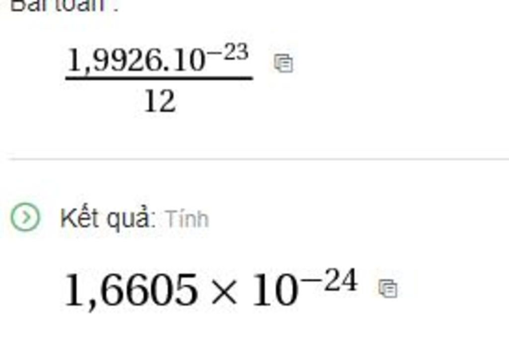 $\text{ Vậy 1 đvC tương ứng }$ $\dfrac{1,9926.10^{-23}}{12}=$ $1,6605.10^{-24}(g)$