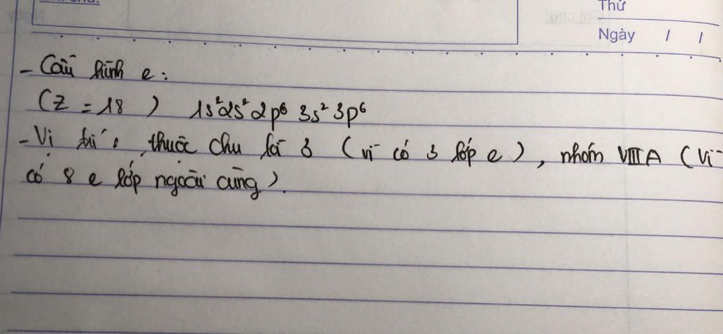 Thuộc nhóm VIIIA vì có 8 electron lớp ngoài cùng và e cuối cùng của nó rơi vào phân lớp p