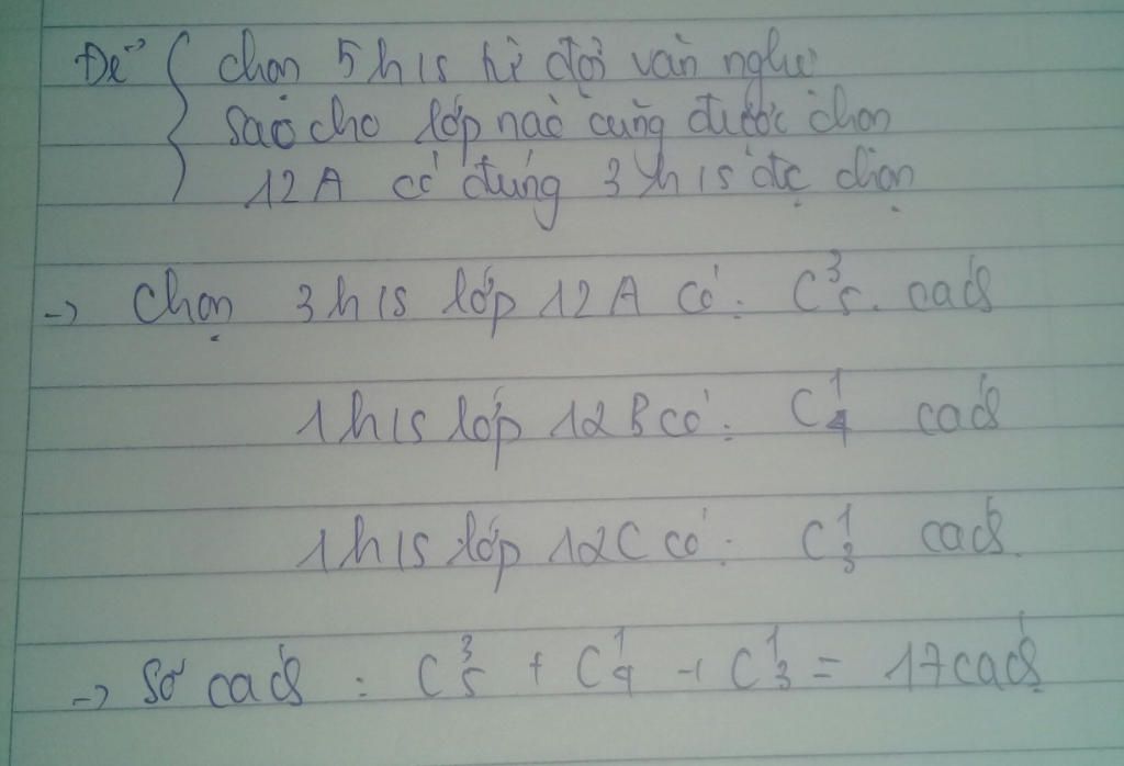 Chọn 3 bạn trong 4 bạn lớp A có $ C\dfrac{3}{4}=4$cách