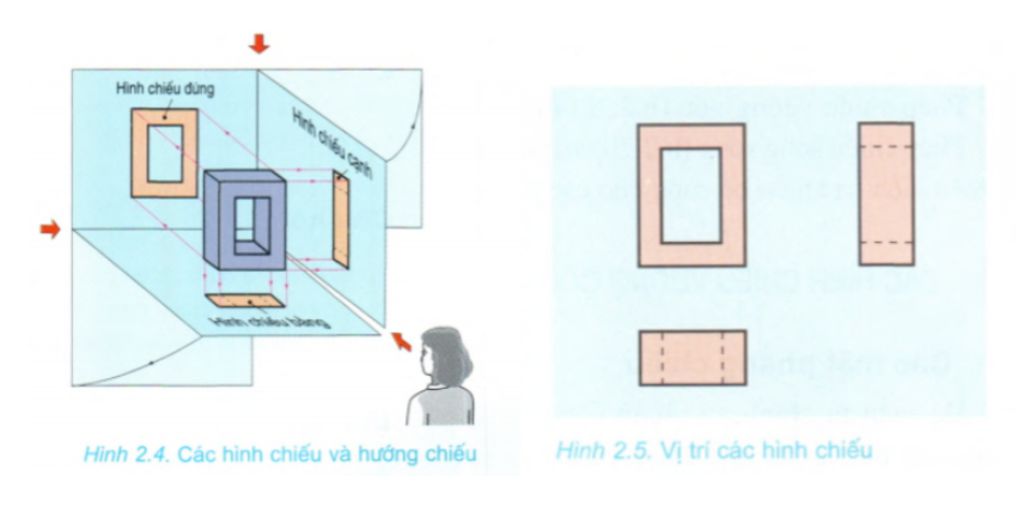 $\Rightarrow $ lấy hình chiếu đứng làm mốc thì hình chiếu bằng ở dưới và hình chiếu cạnh ở bên phải. (xem hình 2.4 và 2.5)