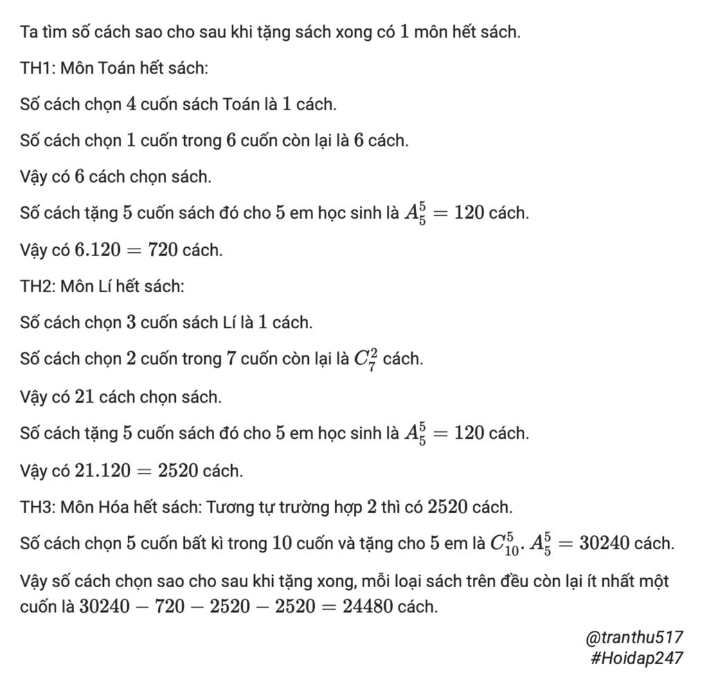 Vậy số cách tặng thỏa mãn yêu cầu bài toán là: