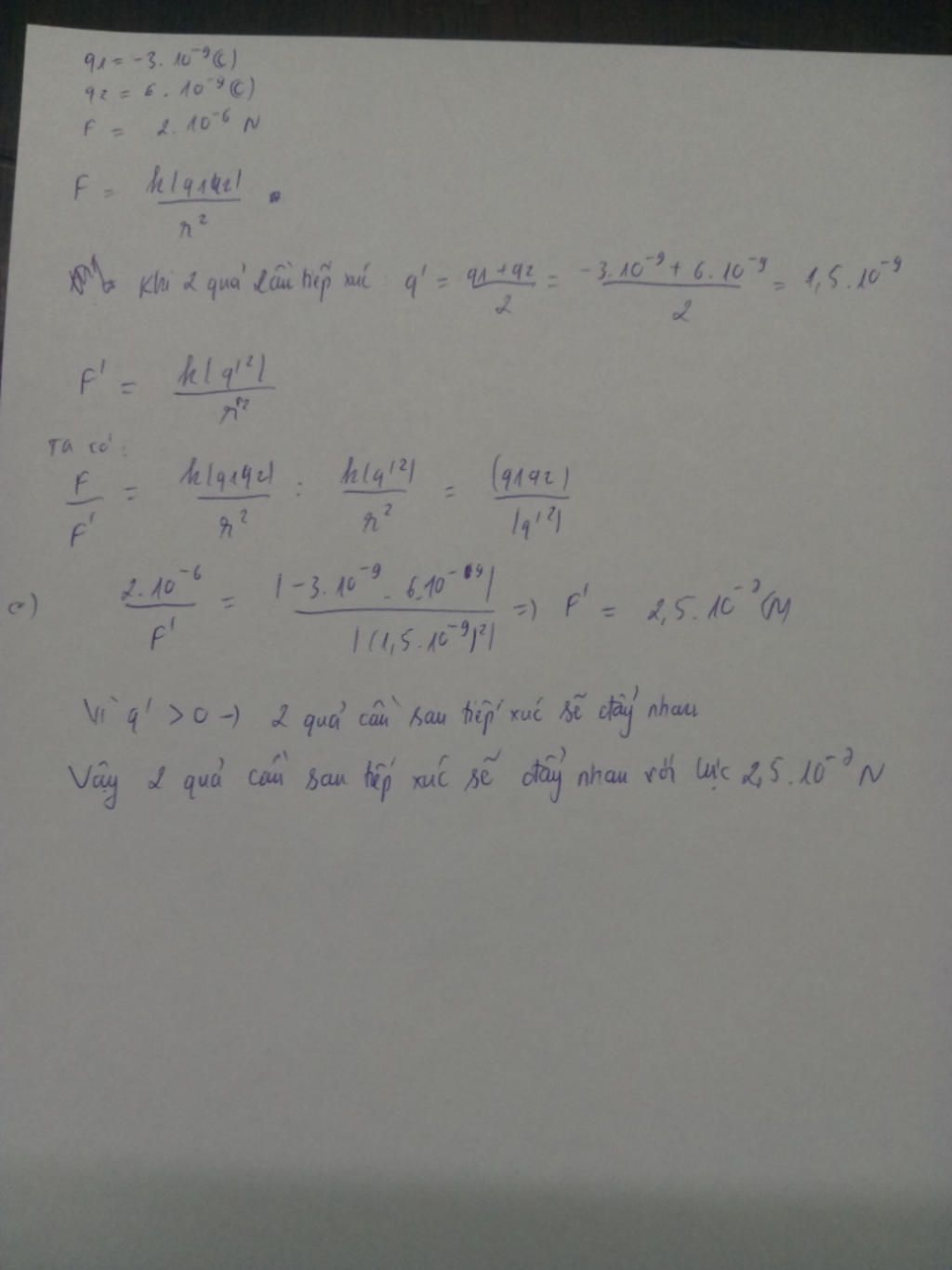 \(q'=\dfrac{{{q}_{1}}+{{q}_{2}}}{2}=\dfrac{-{{3.10}^{-9}}+{{6.10}^{-9}}}{2}=1,{{5.10}^{-9}}C\)