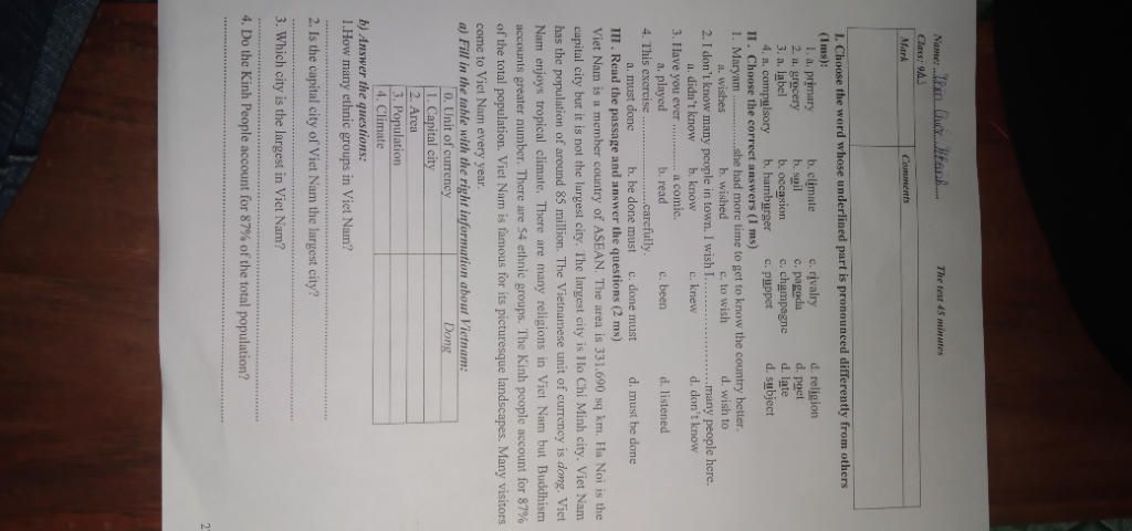 1. D (Phát âm là /i/, còn lại phát âm là /ai/)