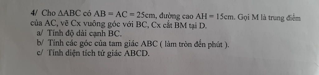 4/ Cho AABC có AB = AC = 25cm, đường cao AH = 15cm. Gọi M là trung