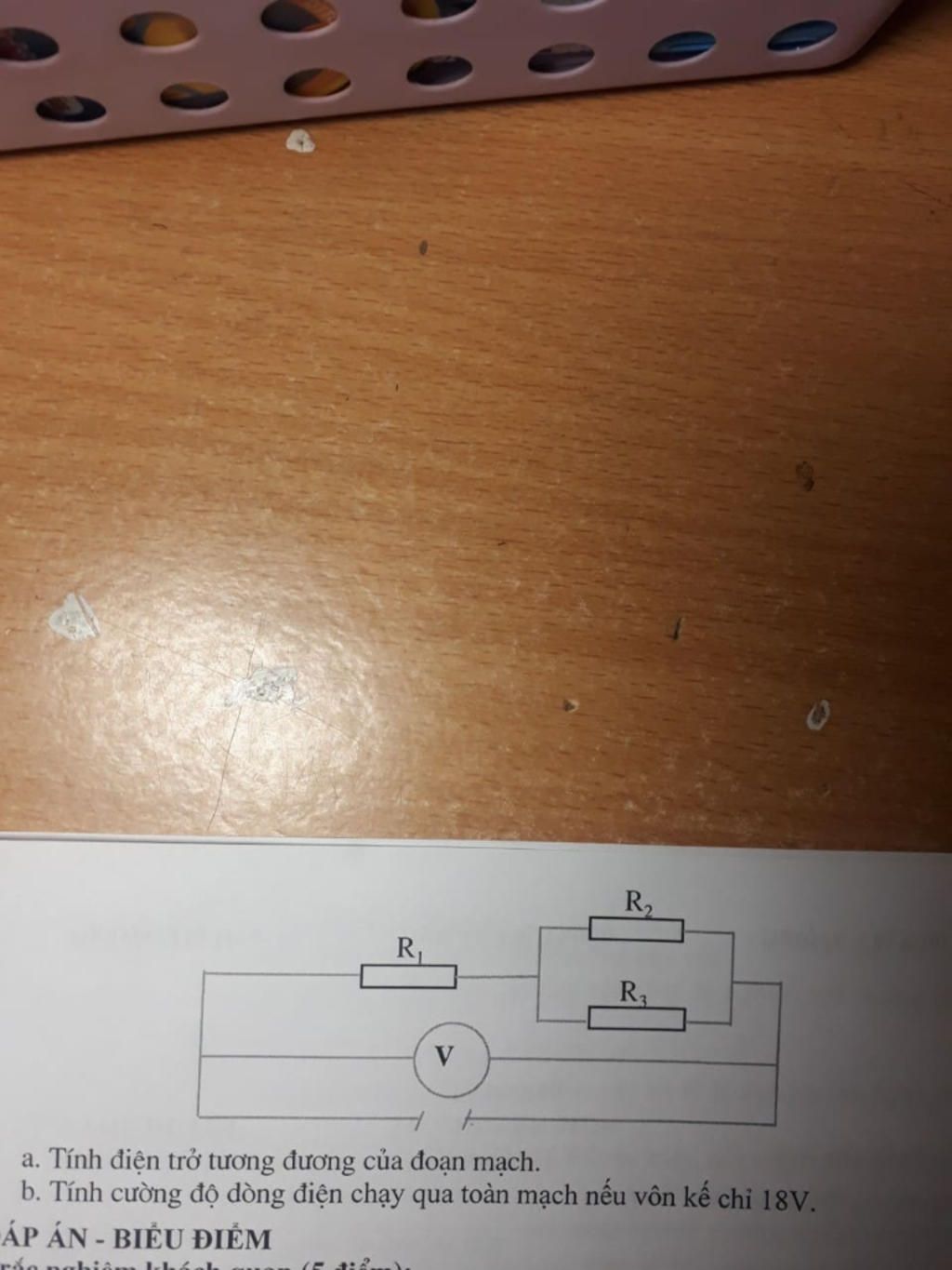 b. Vôn kế chỉ 18V tức là hiệu điện thế đặt vào hai đầu đoạn mạch là $U = 9V$.