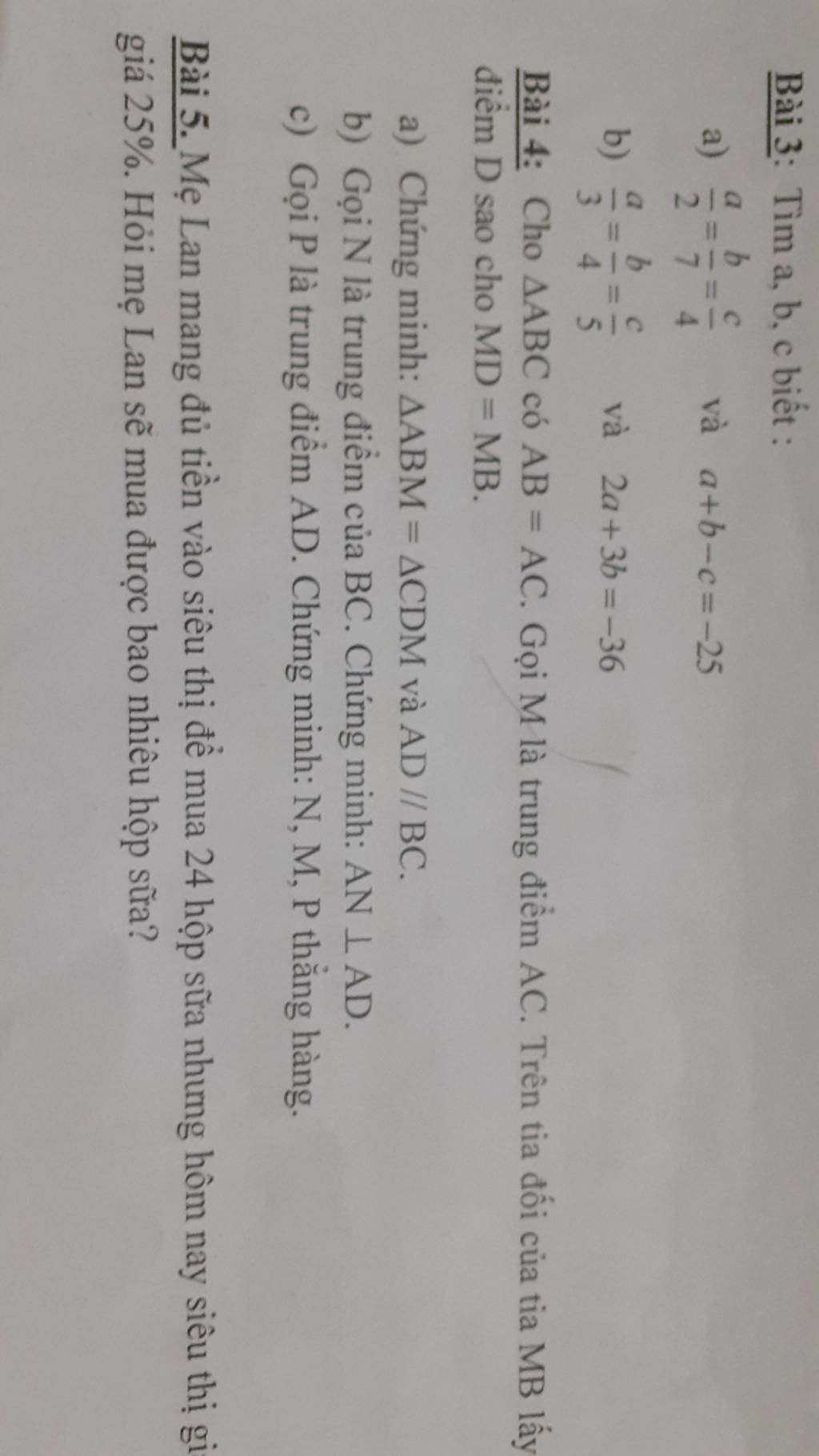 Bài 4: Cho AABC có AB = AC. Gọi M là trung điểm AC. Trên tia đổi của tia MB lấy