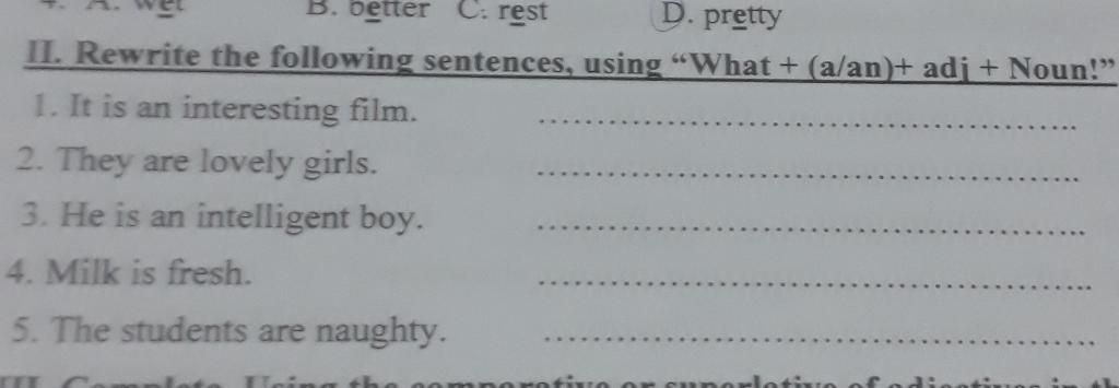 II. Rewrite the following sentences, using "What + (a/an)+ adj + Noun!"