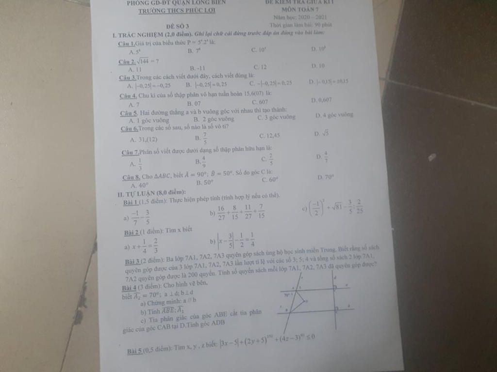1. TRÁC NGHIỆM (2,0 điểm). Ghi lại chữ cdl diềng trước đáp dn đùng vào bài làm