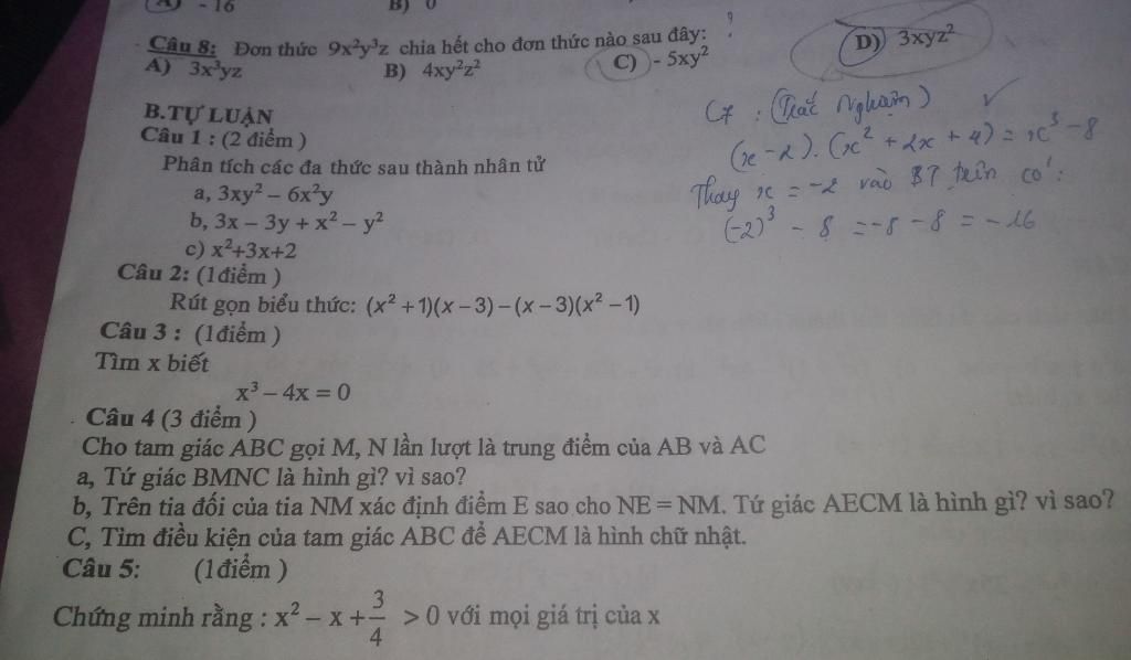 câu 1 b,3x-3y+x^2-y^2 =3.(x-y)+xy.(x-y) =(x-y)+(3+xy)