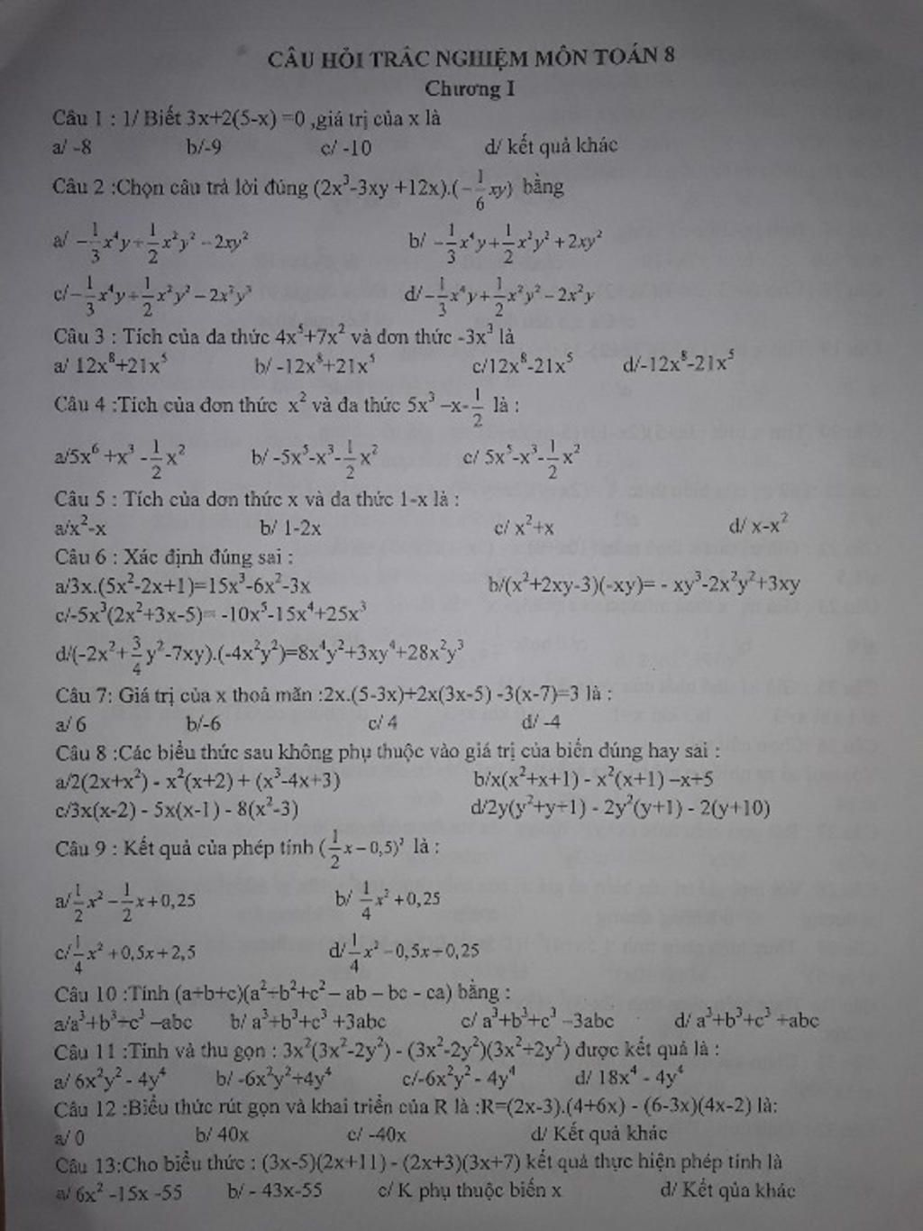 CÂU HỎI TRÁC NGHIỆM MÔN TOÁN 8