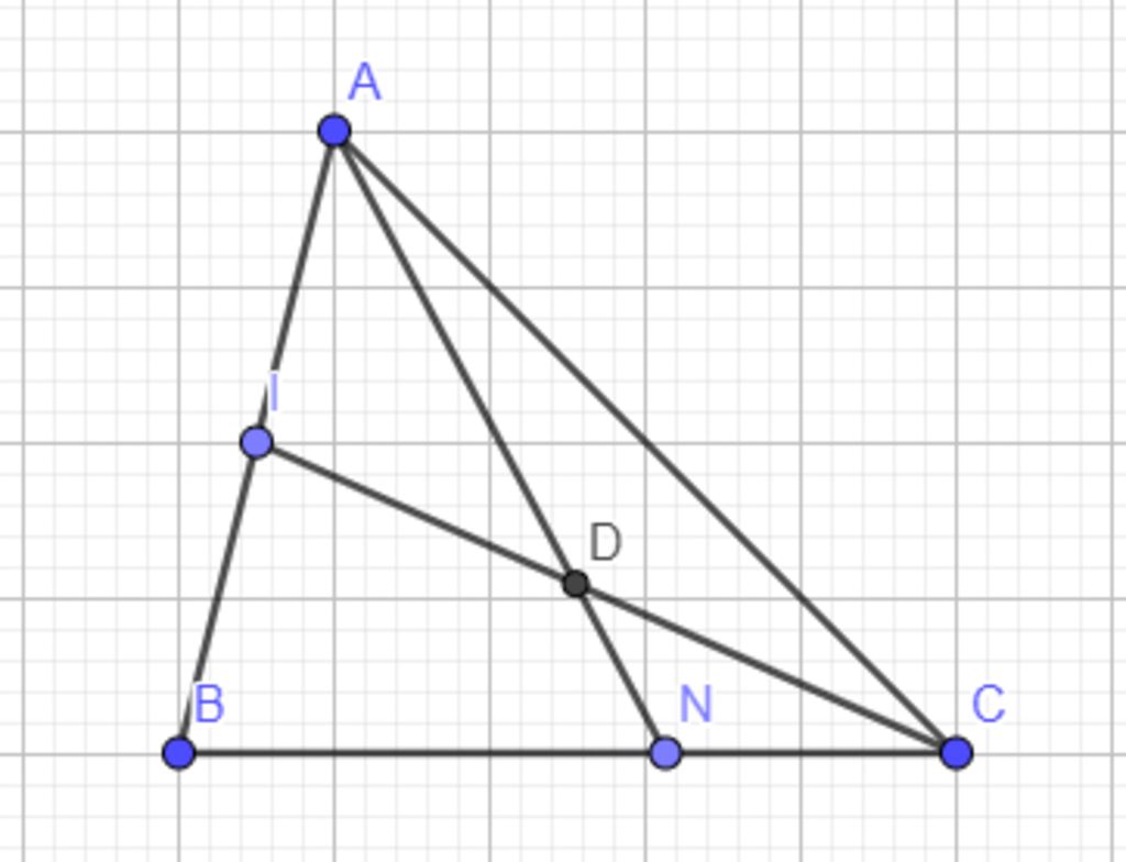 + )\overrightarrow {ND} = \dfrac{1}{2}\left( {\overrightarrow {NI} + \overrightarrow {NC} } \right)\\