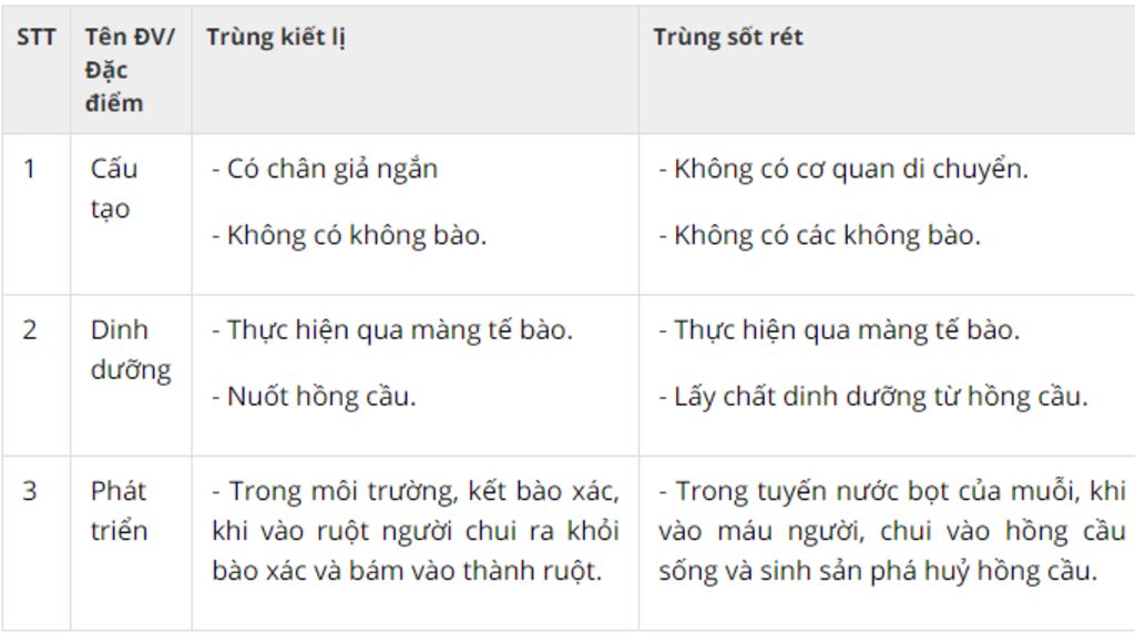 - Trùng sốt rét thích nghi với kí sinh trong máu người, trong thành ruột và tuyến nước bọt của muỗi Anôphen. Chúng có kích thước nhò. không có bộ phận di chuyên và các không bào, hoạt động dinh dưỡng đểu thực hiện qua màng tế bào.