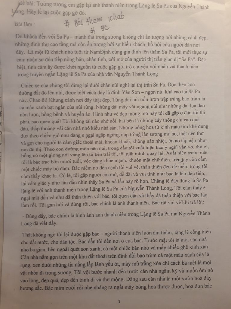 Du khách đến với Sa Pa – mảnh đất trong sương không chỉ ấn tượng bởi những cảnh đẹp, những dinh thự cao tầng mà còn ấn tượng bởi sự hiếu khách, hồ hởi của người dân nơi đây. Là một lữ khách nhỏ tuổi từ thủ đô Hà Nội, cùng gia đình lên thăm Sa Pa, tôi mới thực sự cảm nhận sự đón tiếp nồng hậu, chân tình, cởi mở của người thị trấn giản dị “Sa Pa”. Đặc biệt, tình cảm ấy được khởi nguồn từ cuộc gặp gỡ, trò chuyện với nhân vật thanh niên trong truyện ngắn Lặng lẽ Sa Pa của nhà văn Nguyễn Thành Long. Chiếc xe của chúng tôi dừng lại dưới chân núi nghỉ lại thị trấn Sa Pa. Dọc theo con đường đất đỏ lên núi, được biết cách đây là đỉnh Yên Sơn – ngọn núi khá cao tại Sa Pa này. Chao ôi! Khung cảnh nơi đây thật đẹp. Từng dải núi uốn lượn trập trùng bao trùm là cả màu xanh bạt ngàn của núi rừng. Những dải mây vắt ngang núi như những dải lụa đào uốn lượn, bồng bềnh và huyền ảo. Hình như vẻ đẹp mộng mơ này tôi đã gặp ở đâu rồi thì phải, sao quen quá! Tôi không tài nào nhớ nổi, hai bên là những cây thông chỉ cao quá đầu, thấp thoáng vài căn nhà nhỏ kiểu nhà sàn. Những bông hoa tử kinh màu tím khẽ đung đưa theo chiều gió như đang e ngại ngập ngừng núp trong làn sương mù ảo, thật nên thơ và gợi cho người ta cảm giác thoải mái, khoan khoái, không náo nhiệt, ồn ào tấp nập như nơi đô thị. Theo con đường mòn nên núi, trong đầu tôi xuất hiện bao ý nghĩ vẩn vơ, thú vị, bỗng có một giọng nói vang lên từ bên trái tôi, tôi giật mình quay lại. Xuất hiện trước mắt tôi là bác trạc bốn mươi tuổi, vóc dáng khỏe mạnh, khuôn mặt chữ điền, trên tay còn cầm một chiếc máy bộ đàm. Bác niềm nở đến cạnh tôi vui vẻ, thân thiện đến dễ mến, trong tôi cảm thấy khác lạ. Có lẽ, tôi gặp người cởi mở, dễ dãi và vui tính như bác là lần đầu tiên, lại cảm giác y như lần đầu nhìn thấy Sa Pa và lần này rõ hơn. Chẳng lẽ đây đúng là Sa Pa lặng lẽ với anh thanh niên trong Lặng lẽ Sa Pa của Nguyễn Thành Long. Tôi cảm thấy e ngại mất dần và như đã thân thiện với bác, tôi quen dần và thấy đã thân thiện với bác lâu lắm rồi. Tôi gạn hỏi và đúng rồi, bác chính là anh thanh niên. Bác rất vui vẻ khi trả lời: - Đúng đấy, bác chính là hình ảnh anh thanh niên trong Lặng lẽ Sa Pa mà Nguyễn Thành Long đã viết đấy. Thật không ngờ tôi lại được gặp bác – người thanh niên luôn âm thầm, lặng lẽ cống hiến cho đất nước, cho dân tộc. Bác dẫn tôi đến nơi ở của bác. Trước mặt tôi là một căn nhà nhỏ ba gian, bên ngoài quét sơn xanh, có một chiếc bàn nhỏ và mấy chiếc ghế xinh xắn. Căn nhà nằm gọn trên một khu đất thoải trên đỉnh đồi bao trùm cả một màu xanh của lá rụng, xen dưới những tia nắng lấp lánh yếu ớt, mây mù trắng xóa chỉ cách ba mét là mọi vật nhòa đi trong sương. Tôi vội bước nhanh đến trước căn nhà ngắm kỹ và muốn ôm nó vào lòng, đẹp quá, đẹp đến bình dị và thơ mộng. Đằng sau căn nhà là một vườn hoa đầy hương sắc. Bác mỉm cười rồi nhẹ nhàng ra ngắt mấy bông hoa thược dược, hoa dơn bác trao cho tôi, tôi vội đến lấy, trong lòng biết bao vui sướng. Bác mời tôi vào nhà, căn nhà đẹp quá, sạch sẽ, đơn sơ, gọn gàng. - Bác chỉ ở một mình thôi ạ? - Ừ! Gia đình bác ở dưới thị xã còn bác ở trên đây một mình công tác. Bác vừa nói vừa pha trà, ấm trà nóng thoang thoảng lại vừa ấm áp lại mát mẻ, bác rót vào một cái tách nhỏ rồi đem đến cho tôi. - Cháu xin ạ! Bác cứ mặc cháu. - Thế cháu lên đây chơi hay là ở hẳn? - Dạ cháu đi du lịch cùng gia đình thôi ạ! - Lên Sa Pa cũng thú vị lắm cháu ạ. Nhưng cũng có cái buồn tẻ, lạnh lẽo, có khi nó làm cho con người ta cô đơn. Tôi lặng đi một lúc, trầm ngâm suy nghĩ: Chắc hẳn bác là một người rất yêu nghề và gắn bó với mảnh đất này. Như để đáp lại cái suy nghĩ thầm kín của tôi, bác nói tiếp: - Quả thực, đôi lúc bác cảm thấy rất buồn, nhất là lần đầu tiên công tác ở đỉnh Yên Sơn. Bác nhíu đôi mày lại như đang suy tư về một điều gì đó. Không khí thật yên tĩnh, thỉnh thoảng có làn gió nhẹ thoảng qua đem theo mùi hoa lẫn mùi cây cỏ, mùi đất của Sa Pa. Một chú chim cất tiếng hót, nó đậu lên cửa sổ, bác khẽ đến bên nó rồi vội nói: - Nhưng không hẳn Sa Pa buồn và lặng lẽ thế đâu cháu ạ. Bác rất vui vì tìm được thú vị, sự say mê trong công việc, hiểu được trách nhiệm của mình với quê hương, mọi vật ở đây đều là bạn của bác. Chúng gắn bó với bác suốt mấy chục năm qua. - Tài thật bác nhỉ, Sa Pa đem lại cho cháu sự ngạc nhiên không chỉ vẻ đẹp của nó mà còn bởi… Tôi vừa nói vừa đi lên giá sách, chưa kịp nói hết, bác đã tiếp lời: - Có phải là những con người ở đây không? - Dạ đúng ạ. - Cháu có biết bác kĩ sư su hào không? - Cháu biết! Cháu biết qua lời giới thiệu của bác với ông h