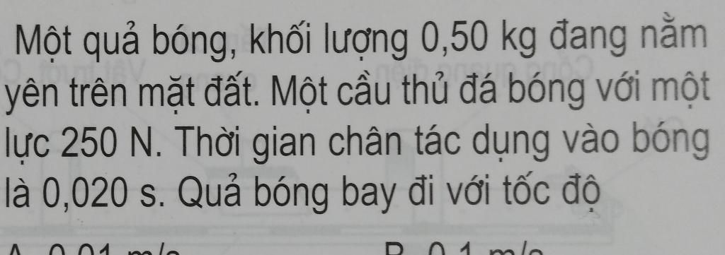\Leftrightarrow v = \dfrac{{F\Delta t}}{m} = \dfrac{{250.0,02}}{{0,5}} = 10m/s
